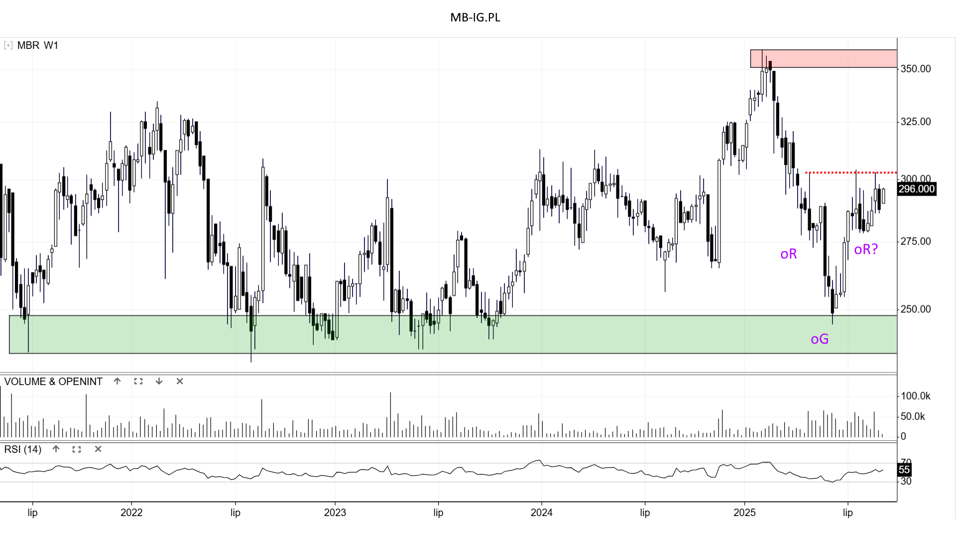 Podaż przynajmniej na razie nie składa broni. Stąd próby cieniowania świec od góry z akcentem wolumenu w okolicach 300 zł. To w końcu kluczowy element do potwierdzenia lub negacji oRGR.
