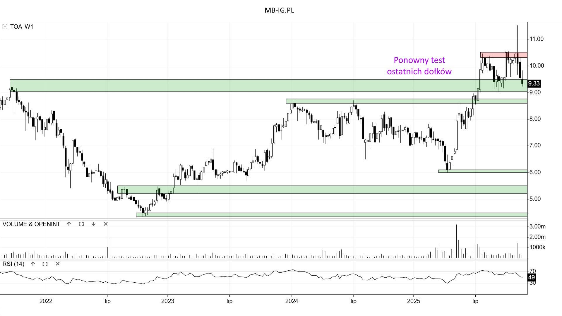 Próby wyrwania się kursu z marazmu nic nie dały, ale to dotyczy obu kierunków. Co ciekawe zbiega się to z charakterem kilkumiesięcznego ruchu cenowego. Wprawdzie jeszcze w ubiegłym tygodniu spółka zaliczyła nowy rekord tegoroczny i historyczny. Tym niemniej popyt nie utrzymał go i podaż ponownie zbiła cenę.