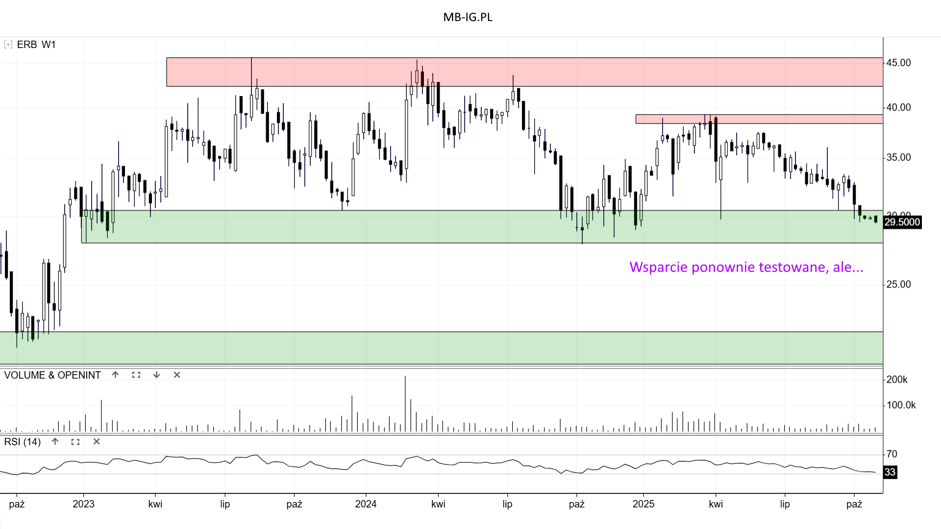 Trudno tu w końcu mówić o jakiejś „górnej granicy” ruchu bocznego, choć są pewne opory np. +/- 38,8 zł. W podanym okresie mamy za to bardziej „stabilne” jedno wsparcie +/- 29,2 zł. Było płycej lub głębiej testowane, ale doprowadzało to w końcu do odbicia. Tym niemniej zwyżki mają charakter krótkoterminowy.