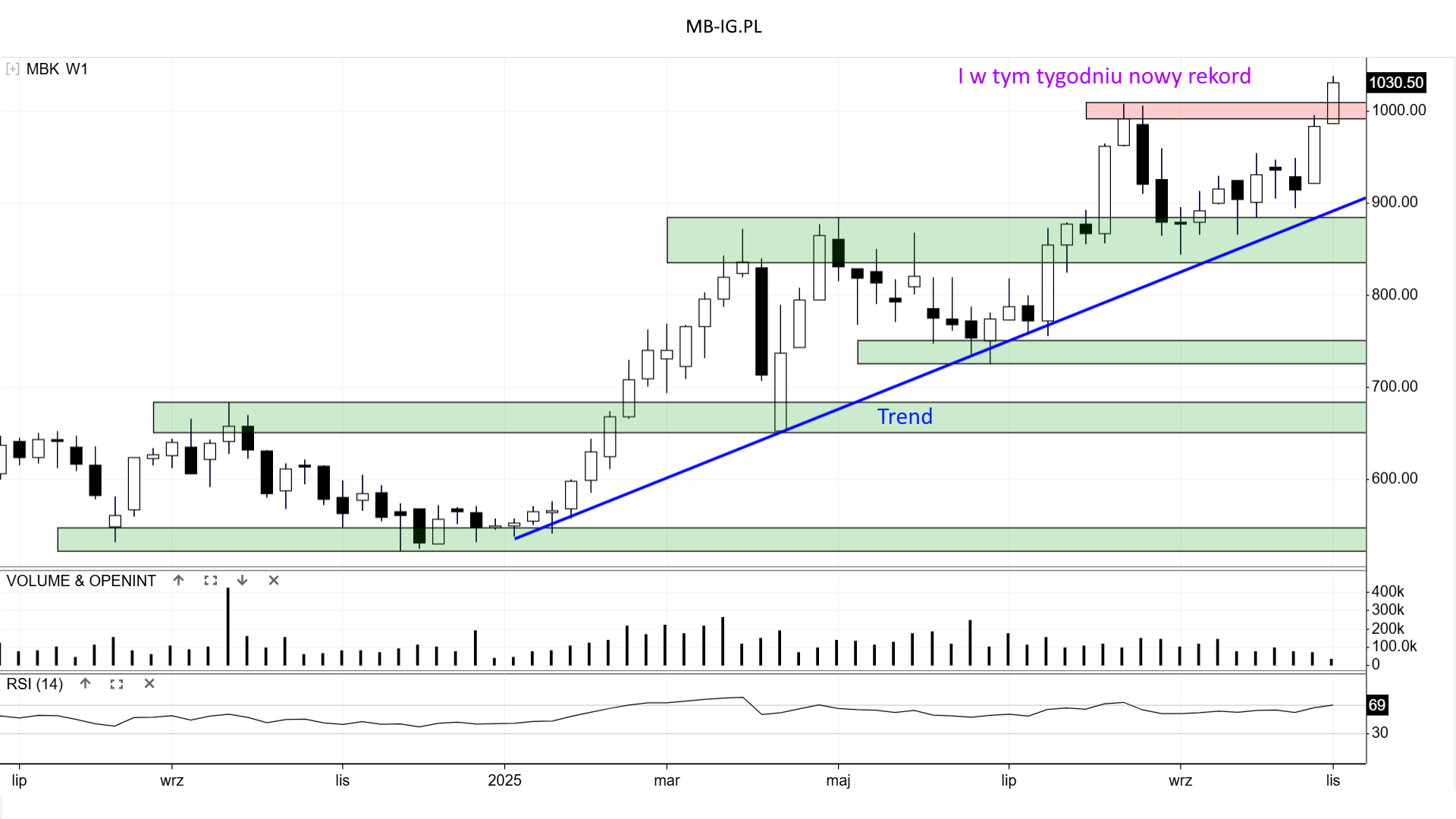 Na koniec października kurs próbuje zaliczy nowy rekord tegoroczny. Przy okazji musi zmierzyć się z oporem z górki +/- 1000 zł. Wyżej cena akcji nie była, więc na ewentualność przebicia trudno określić coś bezpośrednio.