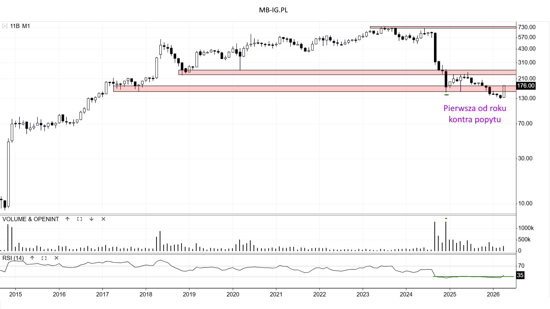 Kurs zalicza udany kwiecień jak na razie, choć to duża zasługa wtorkowego wystrzału o +17%. Dzięki temu opór z dawnego wsparcia +/- 162 zł jest atakowany, a czy zostanie przebity? Formalnie do końca miesiąca zostało już tylko kilka sesji, ale wynik jest jeszcze otwartą sprawą.