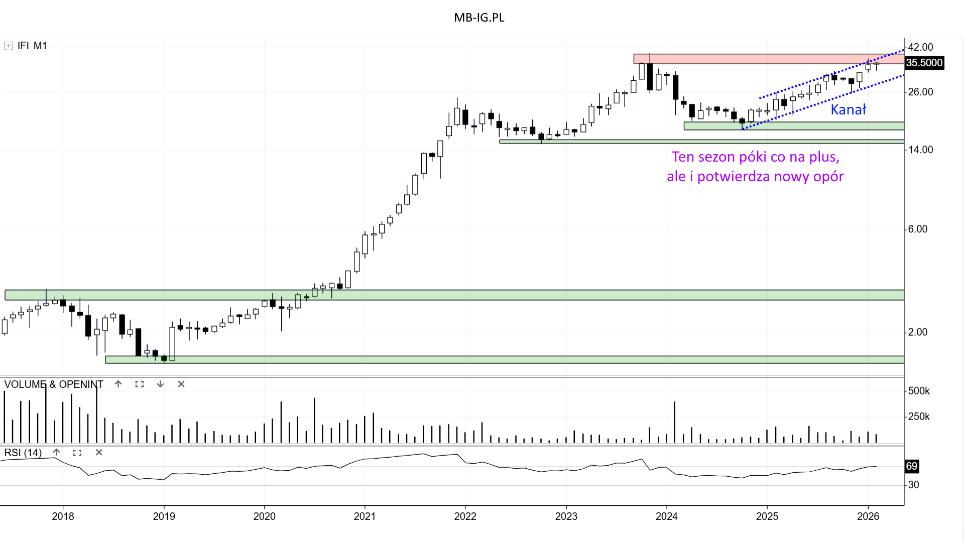 Możemy spróbować określić kilkunastomiesięczną zwyżkę jako Kanał wzrostowy. Nawet jeśli jest dość wąski. Górna granica właśnie zbiega się z oporem, co teoretycznie podkreśla jego znaczenie. Dolna jest wsparciem ruchomym w górę. Obecnie jest to ok. 28,1 zł.