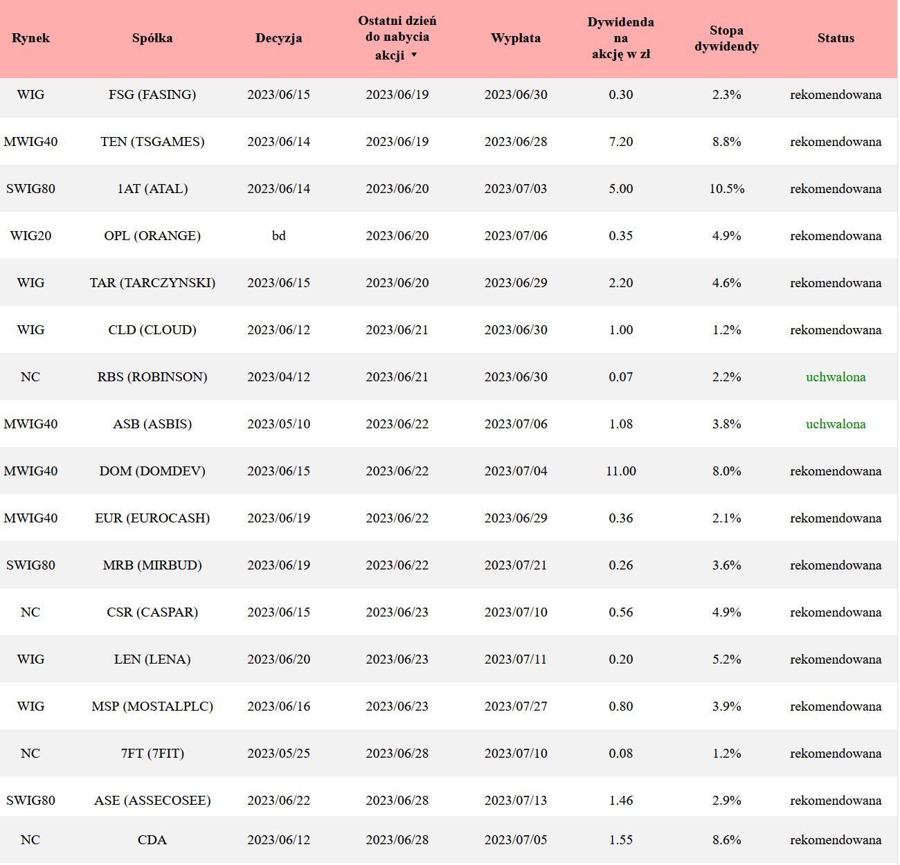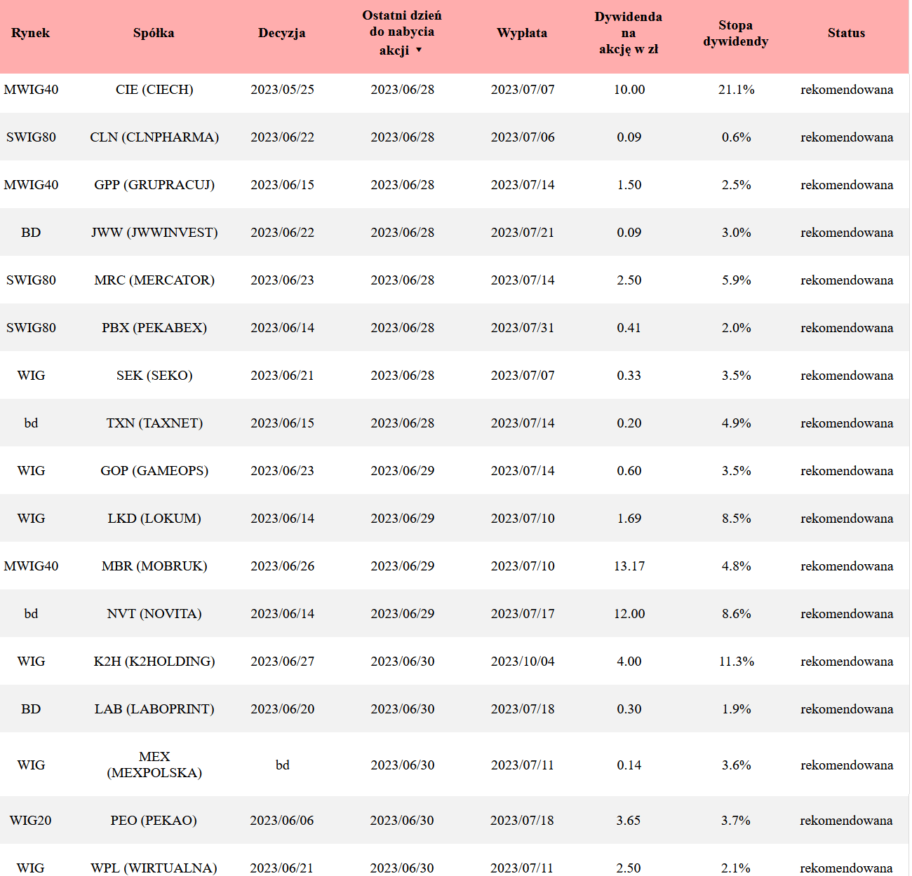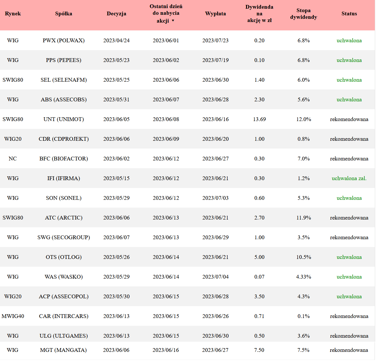 Polecam zajrzeć do głównego artykułu o dywidendach 2023 – pojawili się nowi kandydaci od publikacji czerwcowego zestawienia, a sporo spółek podało też daty Walnych, które wypadną jeszcze w czerwcu.