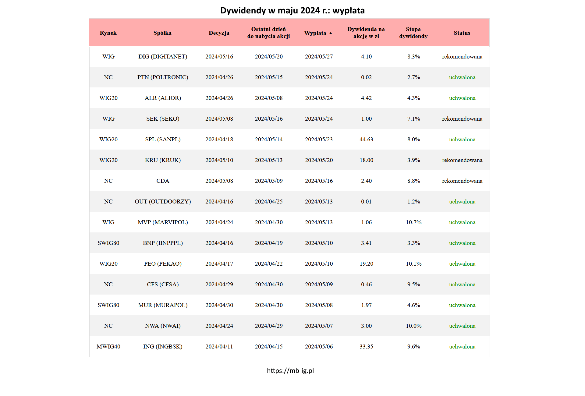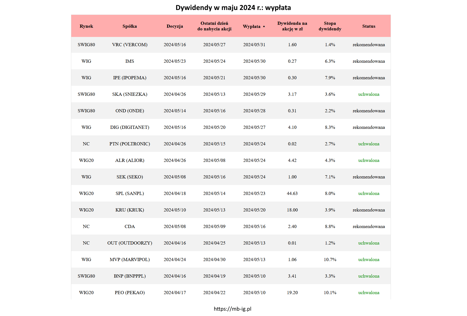 Dywidendy Wiosna w temacie dywidendy w maju 2024 r. PrzezMichał Bednarz 02/05/202406/02/2025 Dywidendy w maju 2024 r.: wypłaty W tym miesiącu temat dotyczy łącznie 31 wypłat: Warto przy okazji pamiętać, że: a) decyzje o wypłacie zapadły dopiero w 19 przypadkach b) a w 12 jest już za późno na zakupy Strony: 1 2 3 4 5