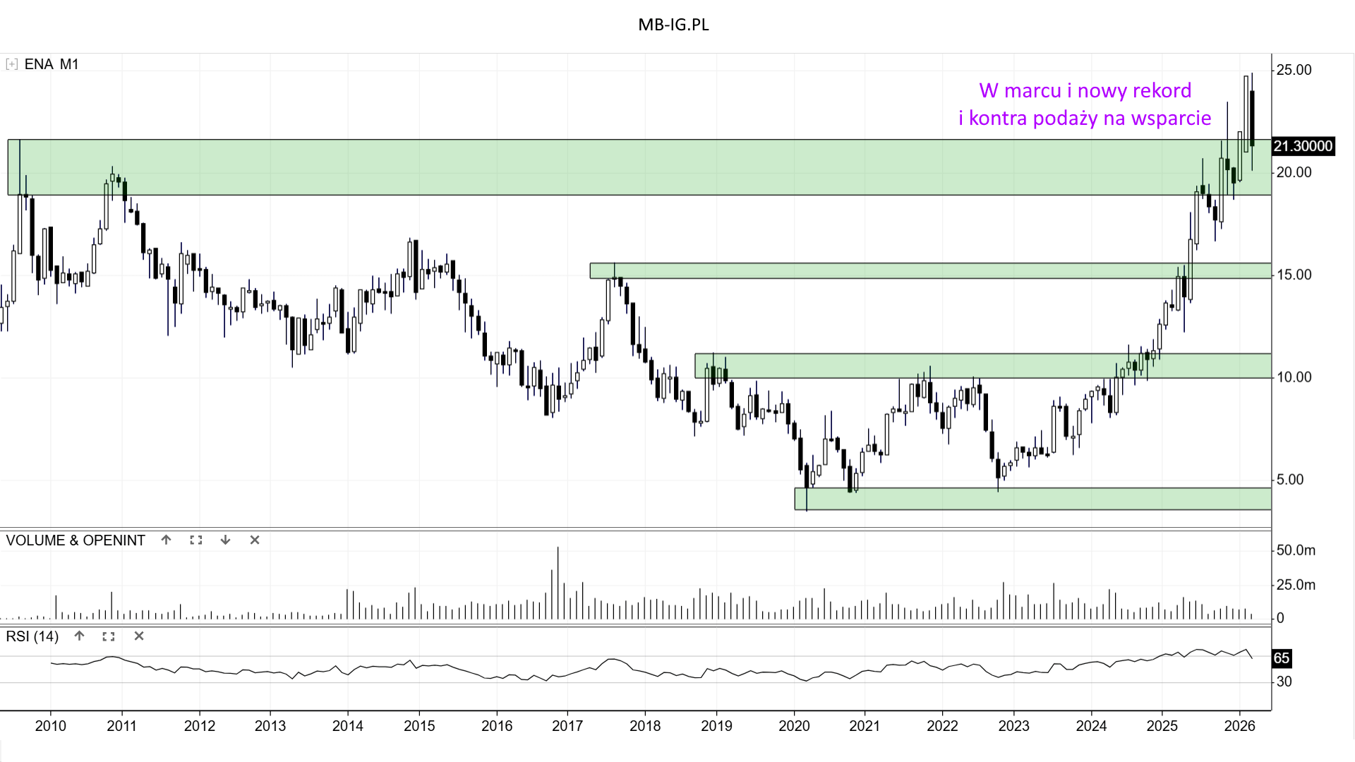 Ze wstępnych danych za 4Q wynika, że Enea (ENA) straciła 840 mln zł. Jednak 2025 r. miał być zyskowny. A jak wojna z Iranem wpływa na kurs w 1Q? Marzec jest póki co spadkowy.