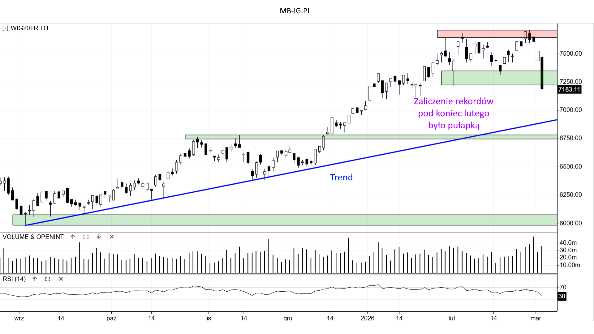 Formalnie najbliższe wsparcie krótkoterminowe to Trend wzrostowy od dołków wrześniowych. Tyle że linia nie dotarła nawet do 7000 punktów. Chyba że Byki ot tak jutro spróbują zakwestionować dzisiejszy najsilniejszy w tym sezonie spadek.