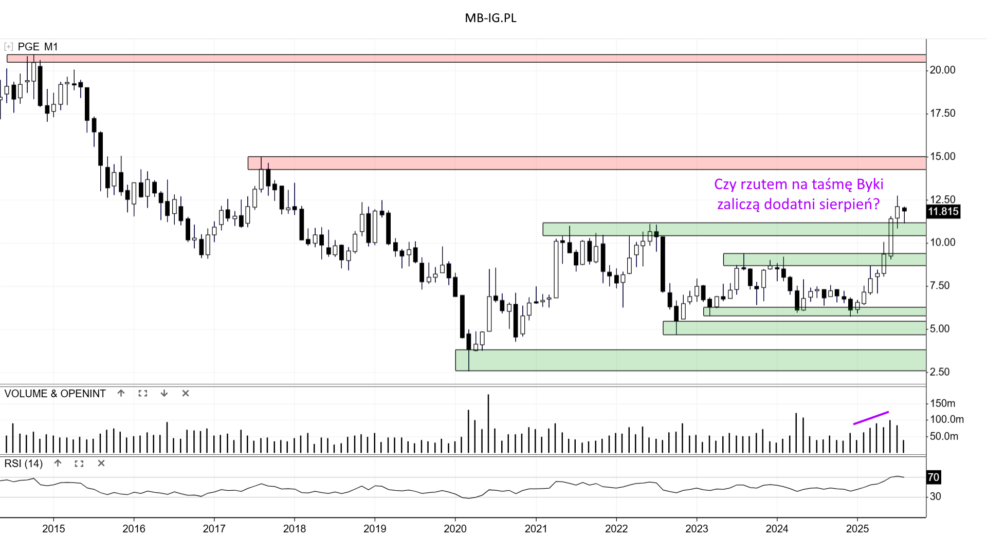 Kurs PGE zaliczył rajd w górę przez w zasadzie 7 miesięcy z rzędu. Do końca sierpnia zostało już niewiele czasu, ale może to być pierwszy miesiąc w tym roku z ujemnym wynikiem. Wyniki finansowe za I półrocze poznamy dopiero we wrześniu.