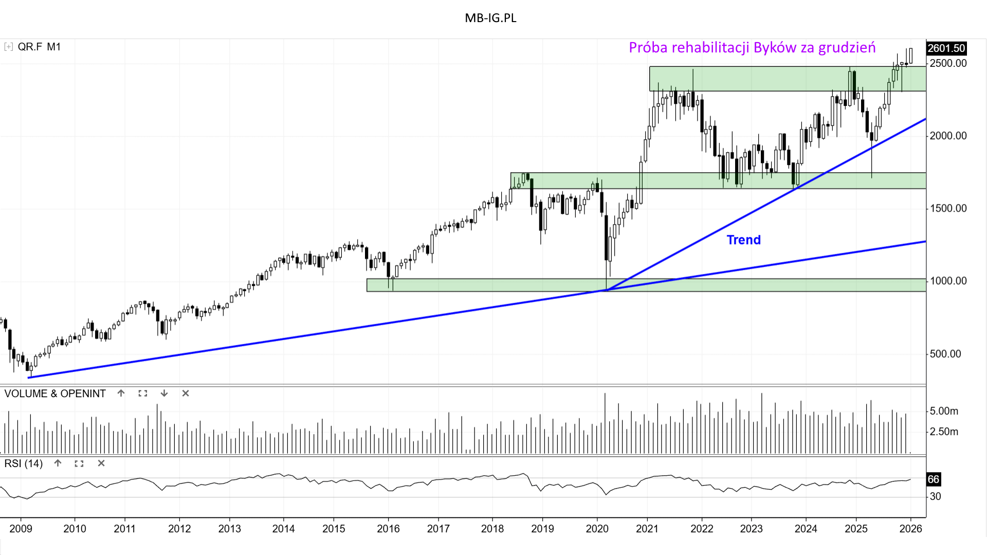 Chwilowe nadbicie w czerwcu 2025 r. szczytów z 2021 r. również zakończyło się bez tak naprawdę poważnych konsekwencji. Cofnięcie było, ale popyt ostatnio stara się pokazać, że to tylko lokalna korekta. Efektowny za grudzień biały korpus z dolnym cieniem to zasługa głównie ostatnich sesji sezonu 2025 r.