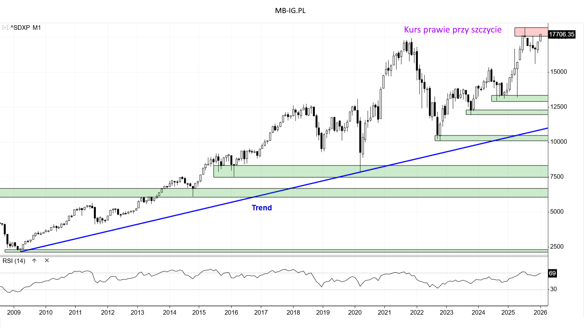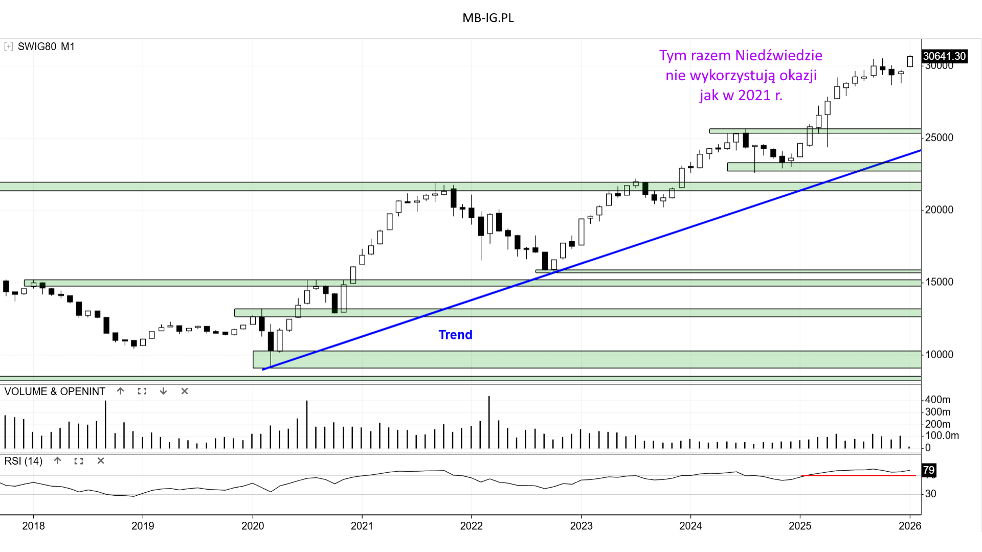 Do końca miesiąca jest daleko, więc kontynuacja wzrostu z impetem nie jest przesądzona na 100%. Słabość uzasadni, że okolice nad 30k punktów to jednak nowy opór. Wyżej brak punktów odniesienia.