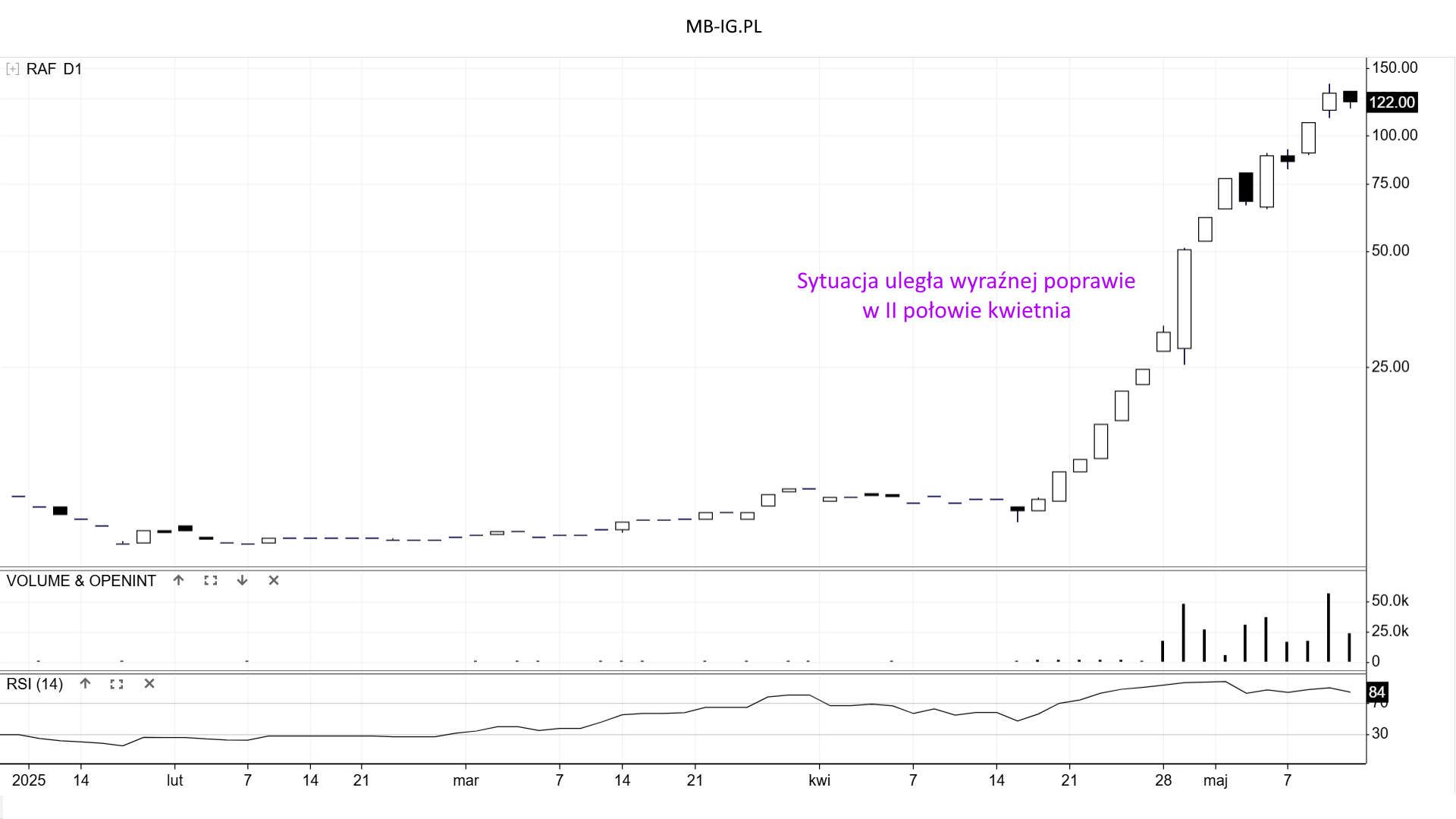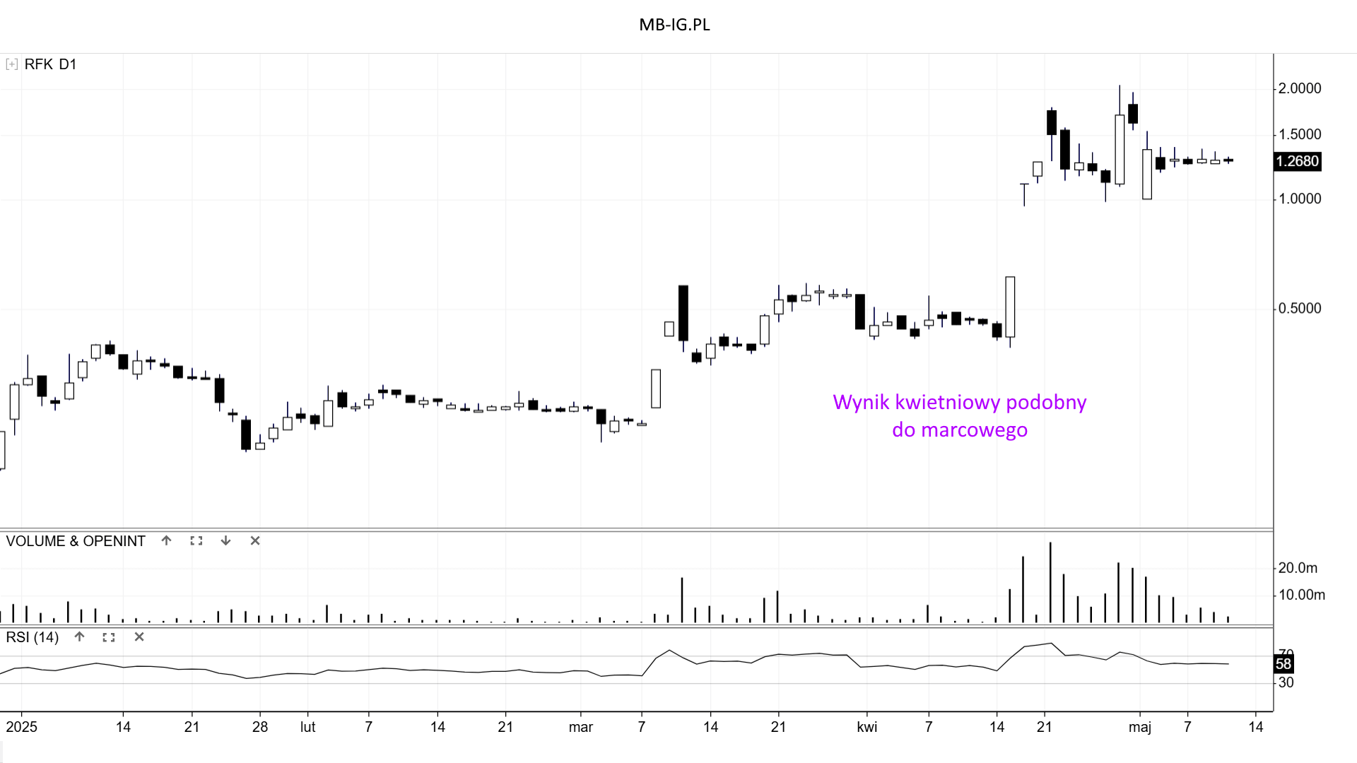 Wcześniej były problemy z notowaniami (poziome kreski zamiast świec). Sytuacja zmieniła się w II połowie kwietnia, a pod koniec miesiąca pojawił się gigantyczny jak na ten walor wolumen.