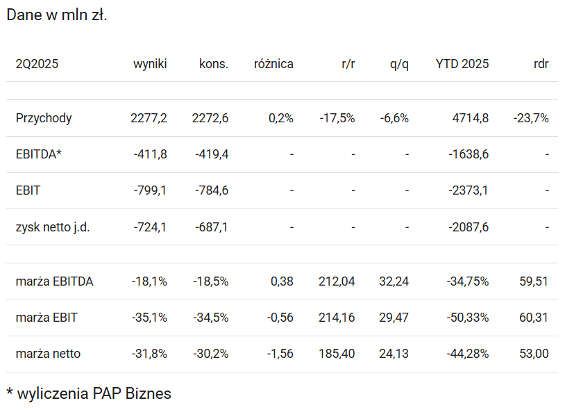 Jednostkowa strata to -724,1 mln zł, a rynek oczekiwał -687,1 mln zł.
