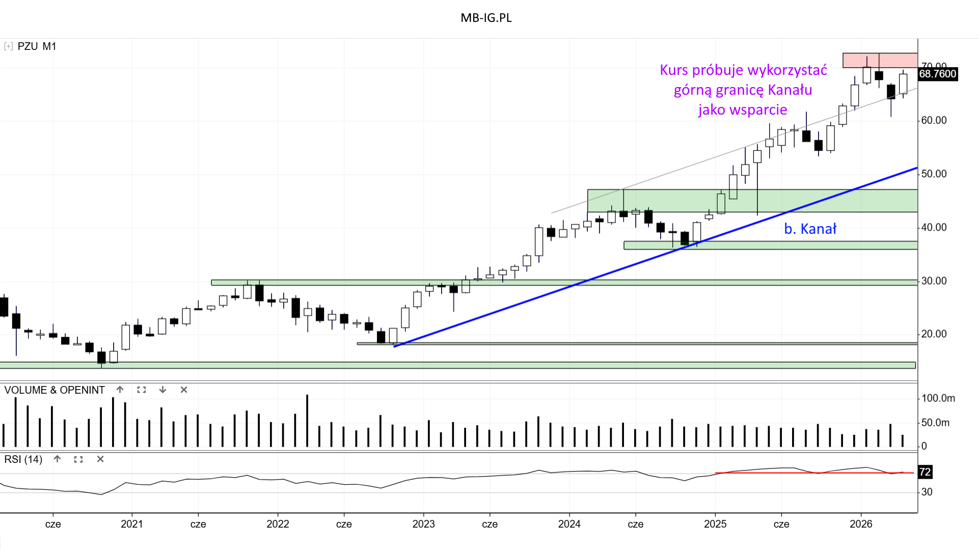 W ostatnim „wojennym” czasie były próby zakwestionowania wybicia z układu. Tyle że tegoroczna wiosna jest póki co popytowa na GPW, to i na tym walorze. Cena akcji jest stosunkowo niedaleko szczytów i potencjalnego oporu przy +/- 71,2 zł. Dla potwierdzenia skuteczności Byków ten poziom musi zostać wybity.