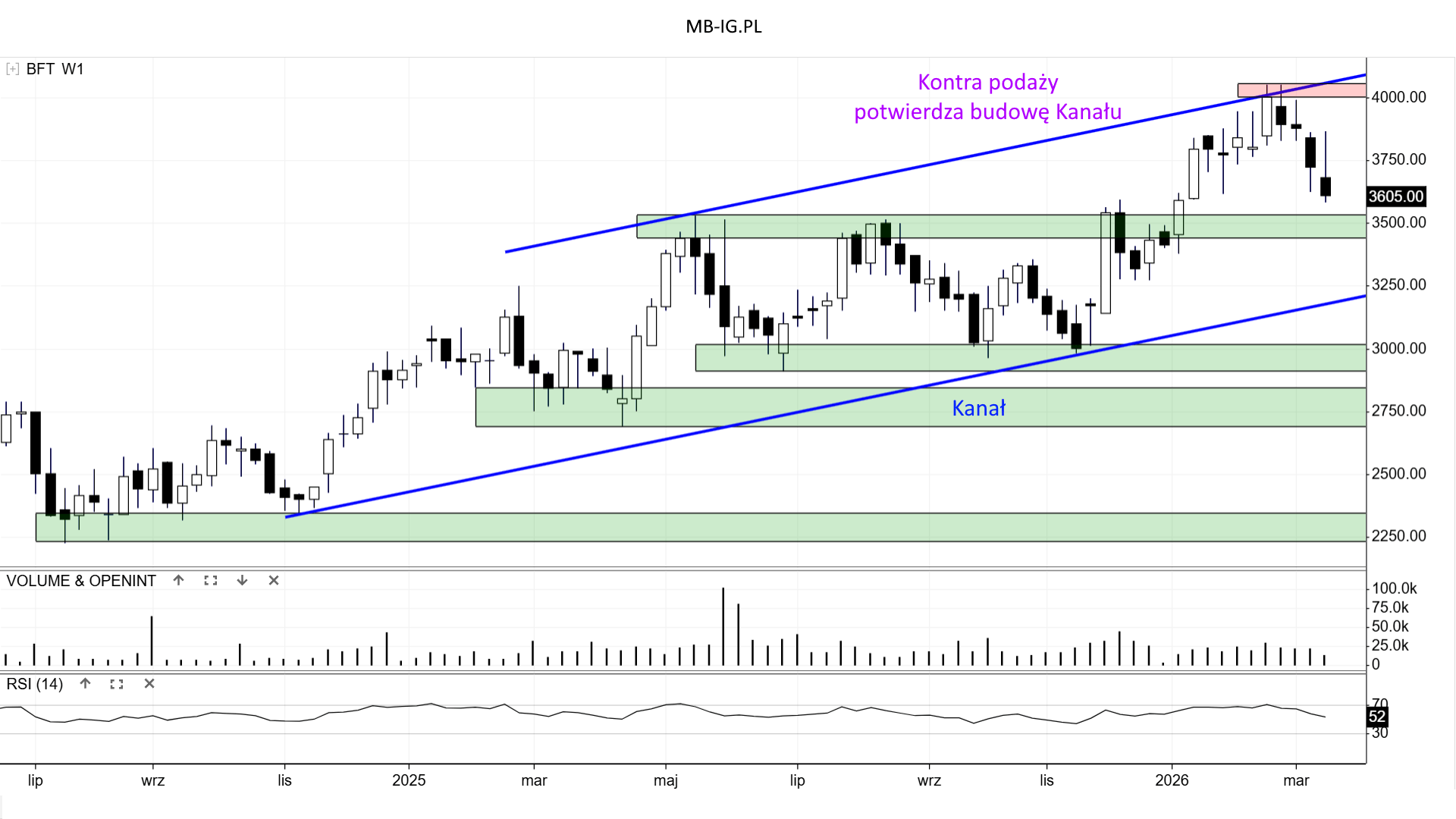 Kurs zbliża się do wsparcia +/- 3,5k zł. Ubiegły tydzień to zmarnowana kontra Byków. Zobaczymy czy przypuszczą bardziej skuteczny atak z niższych rejonów.
