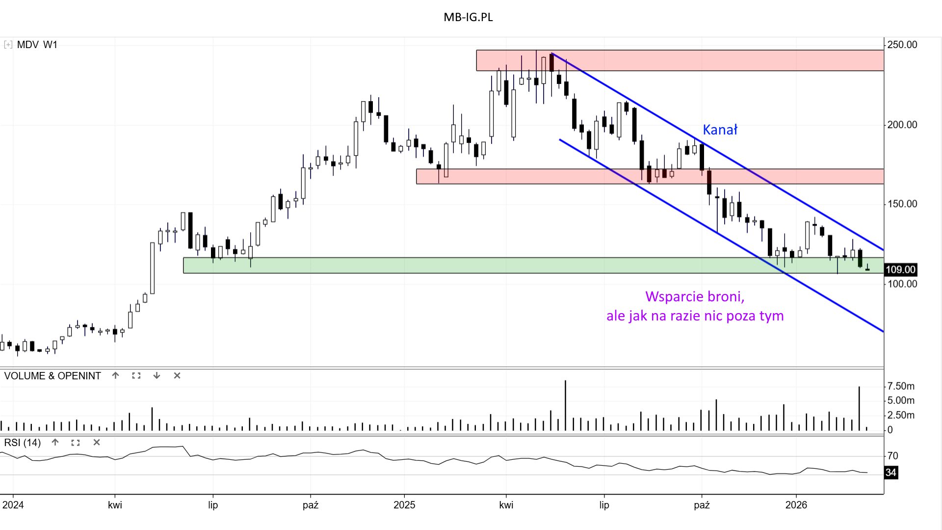 Podaż ma za zadanie wybić wsparcie i otworzyć sobie drogę na 2-cyfrowe poziomy cenowe. Dolna granica Kanału jest dziś na ok. 76,1 zł.