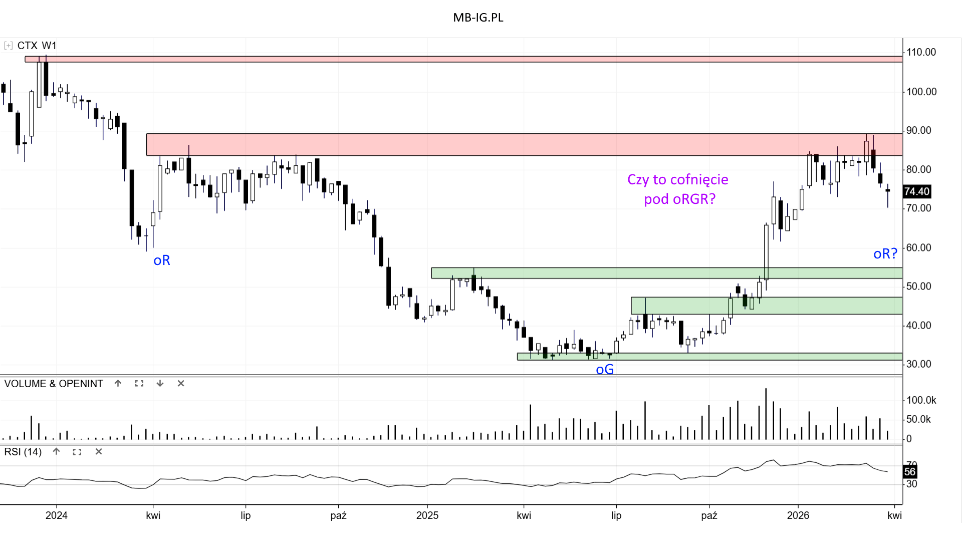 Zobaczymy czy po prostu spadek będzie miał tylko formę większej korekty. Choć do wsparć jest daleko. Najbliższe (nawet jeszcze nie testowane) było z górki sprzed roku +/- 53,5 zł.