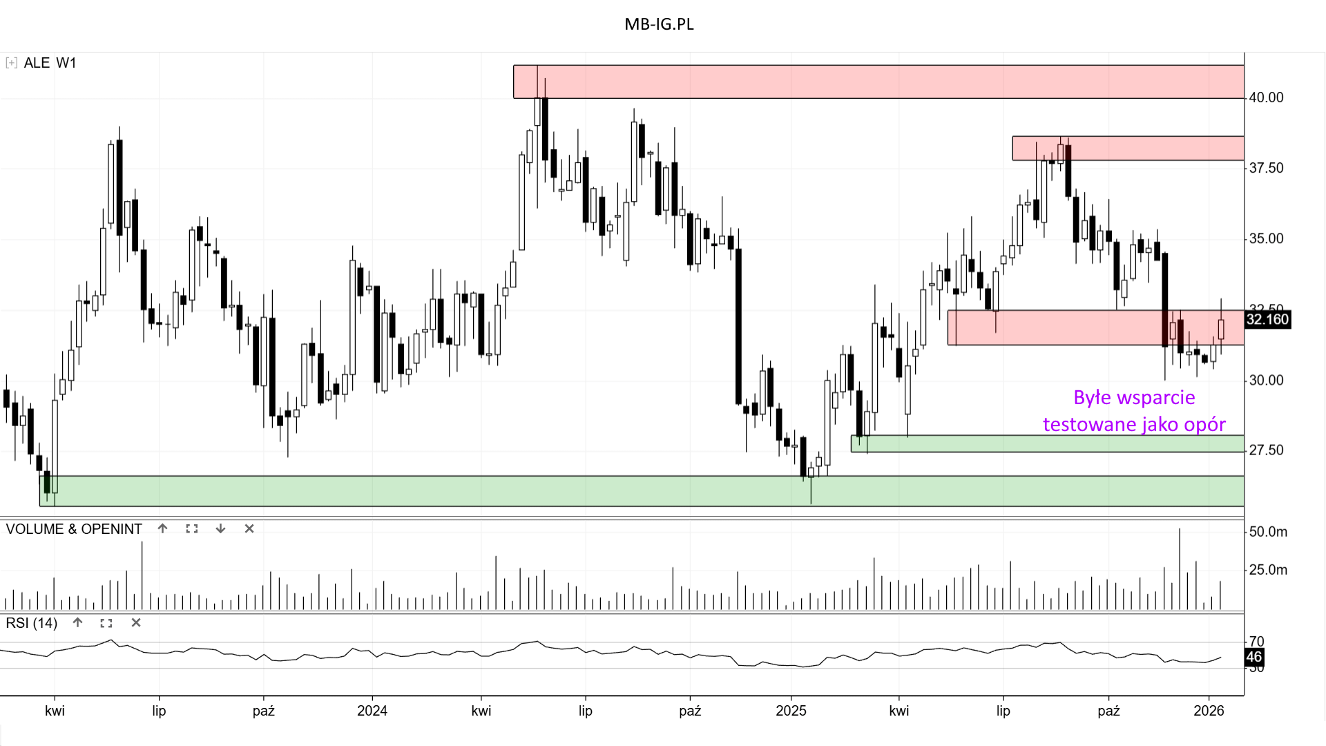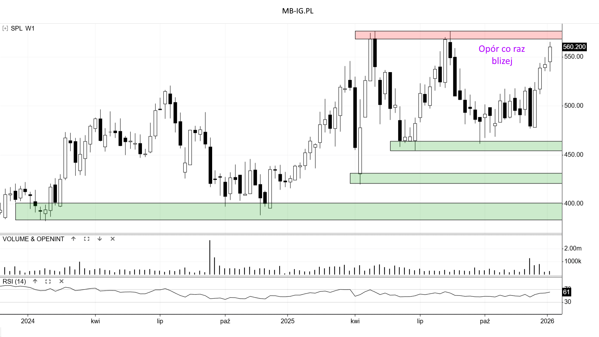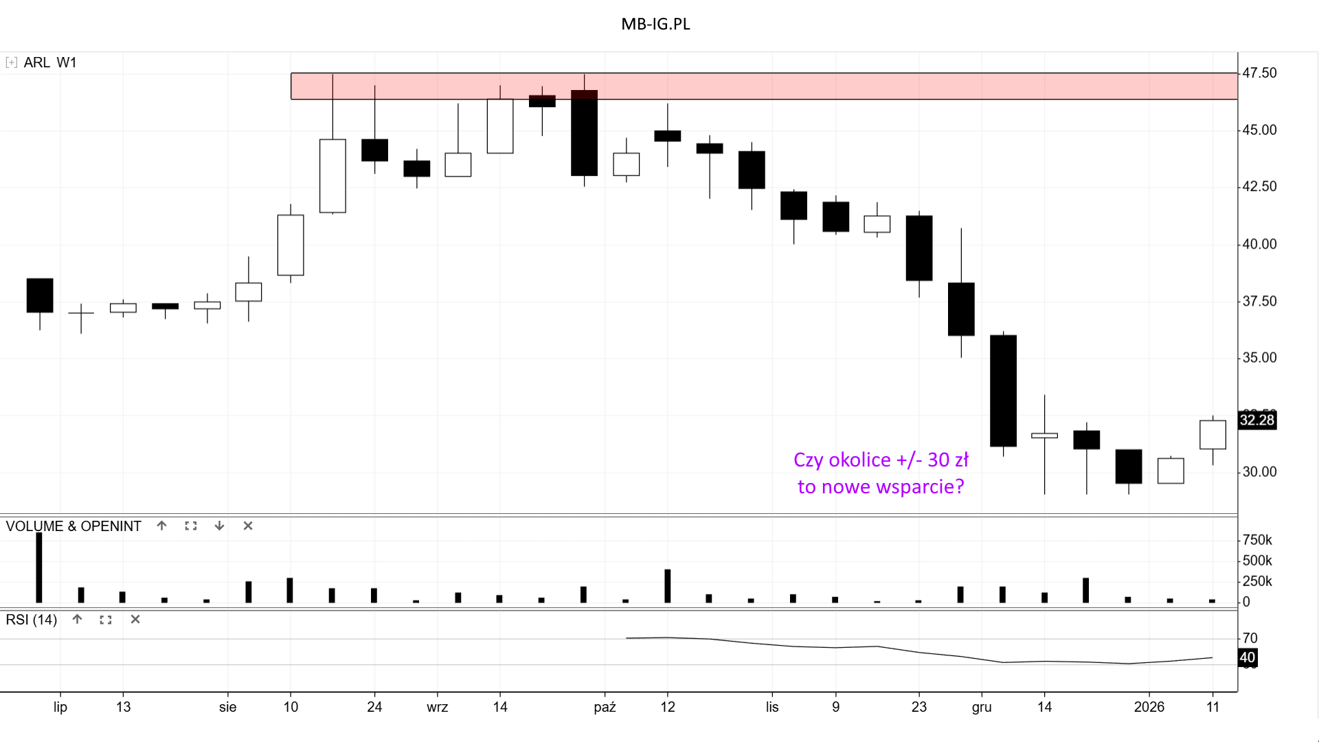 Z drugiej strony popyt próbuje wykazać się jakąś aktywnością i określić, że +/- 30 zł może być wsparciem. Z tym że zasadne będzie dla podkreślenia większe odbicie, które było niewidoczne od jesieni 2025 r.