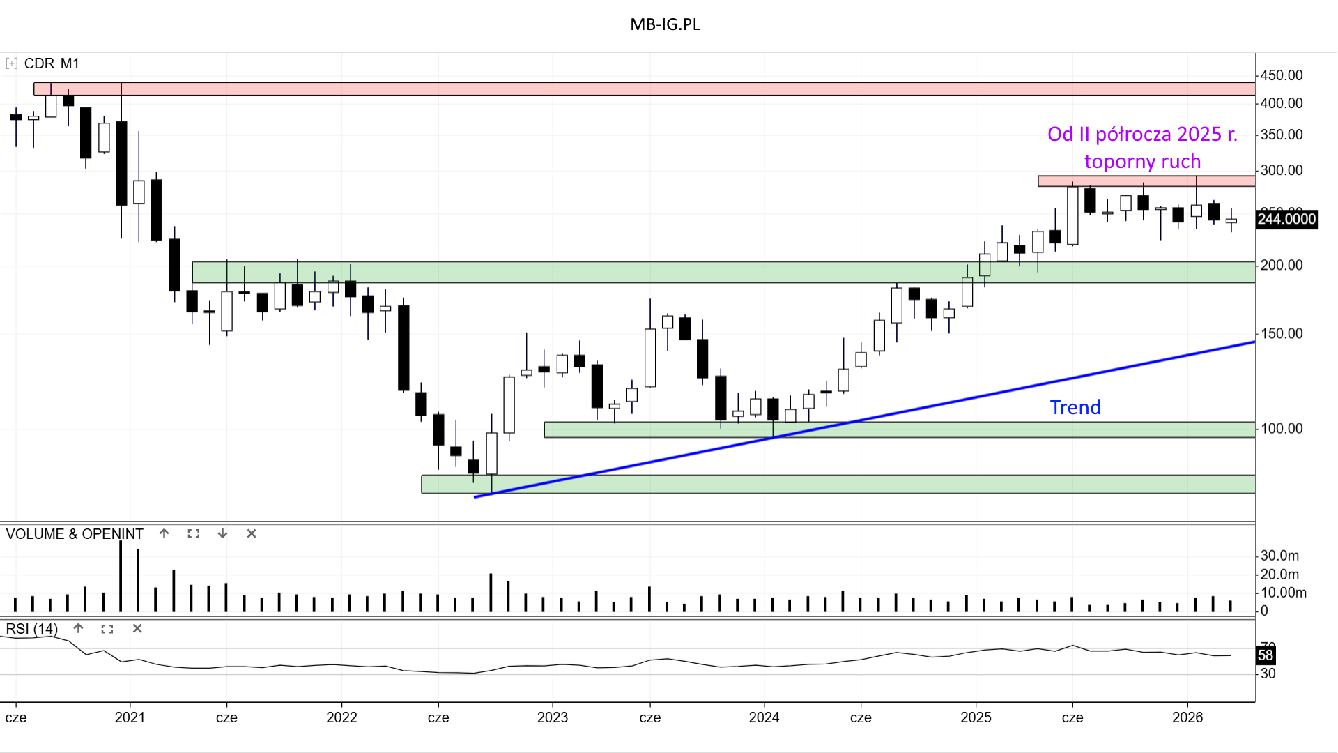 Ze wsparciem jest nieco gorzej. Jest jakieś w rejonie ok. 200 zł. Tyle że toporny charakter ruchu od miesięcy nie pozwala na jego test. Podaż musi zwiększyć atak i zbić kurs pod 250 zł.