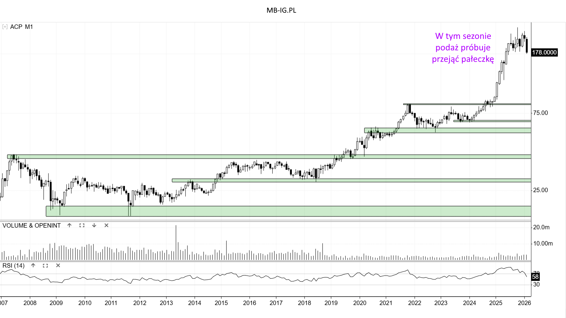 Kurs może być ewentualnie w jakimś lokalnym ruchu bocznym. Tyle że obrona minimów to tylko potwierdzenie specyficznego zachowania. Póki co podaż ma okazję do przejęcia kontroli, ale czy zepchnie kurs na dłużej pod umowne 180 zł?